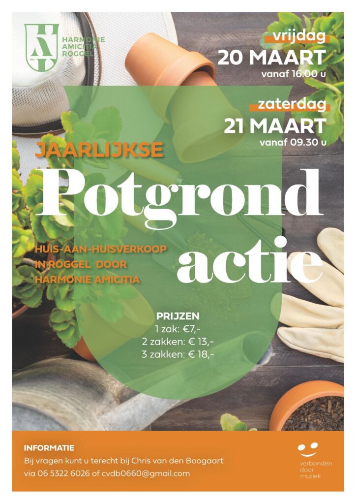 Ook dit jaar kunnen de inwoners van Roggel weer gebruik maken van de Amicitia potgrondactie. Op 20 en 21 maart zullen onze leden het dorp intrekken om u onze hoogwaardige potgrond aan te bieden. Gemakkelijk aan de voordeur bezorgd! De kosten bedragen € 7,00 per zak, 2 zakken voor € 13,00 en 3 zakken voor € 18,00. Heeft u ons gemist of wilt u alvast bestellen? Bel met Chris van den Boogaart, 06 5322 6026 of via mail cvdb0660@gmail.com.
